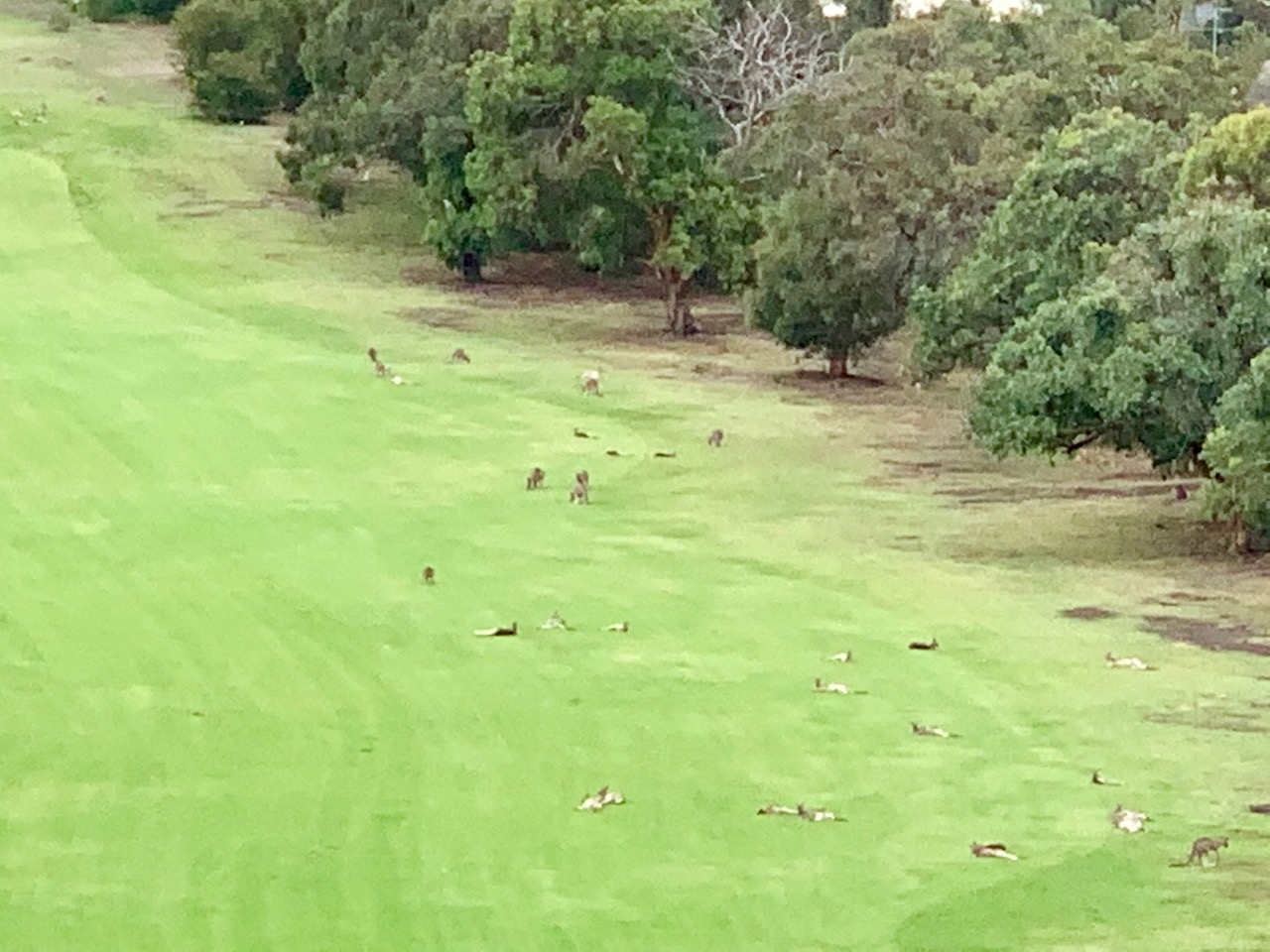 Our original plan was to golf with the Kangaroos the following day. The course is gorgeous and heavily populated with kangaroos. Unfortunately, we woke the next morning to grey skies and pounding rain. The thunder was so loud Deborah thought a plane had crashed into the resort. We had to settle for buying souvenir golf shirts and dinner at the club. That evening, the club president signed us in and the folks could not have been nicer. We had a window table overlooking the 18 hole and were thoroughly entertained by the kangaroos as they hopped and munched around the green.